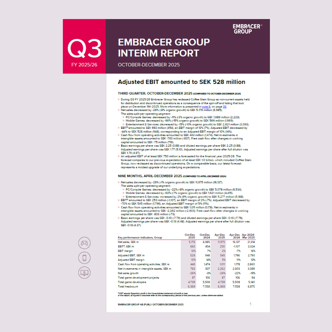 On 11 December 2025, the spin-off of Coffee Stain Group was completed. With a powerful combination of strong IPs, engaged communities, and innovative talent, we remain confident that the separation will create shareholder value. It allows both ourselves and Coffee Stain Group to better concentrate on core strategies and growth opportunities.